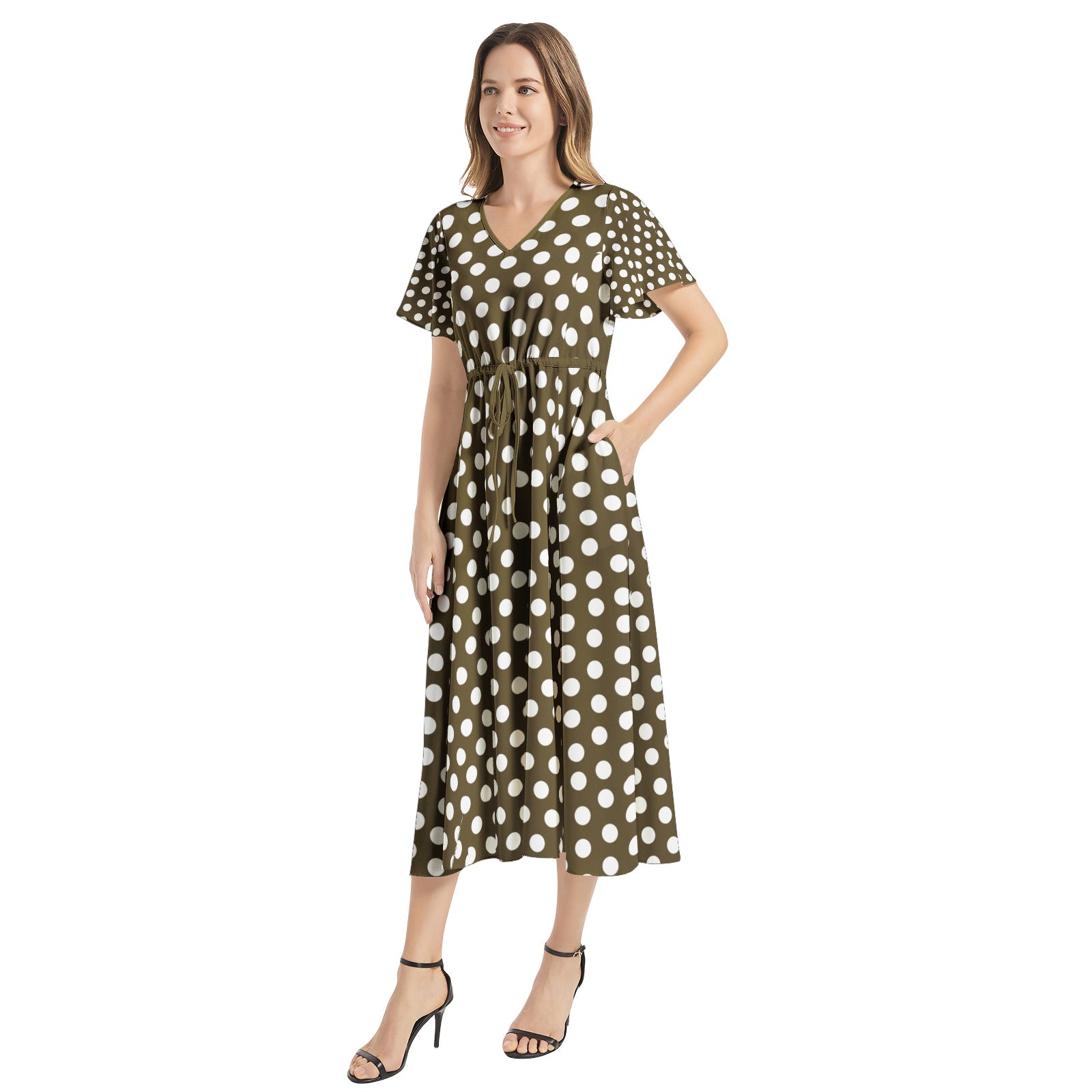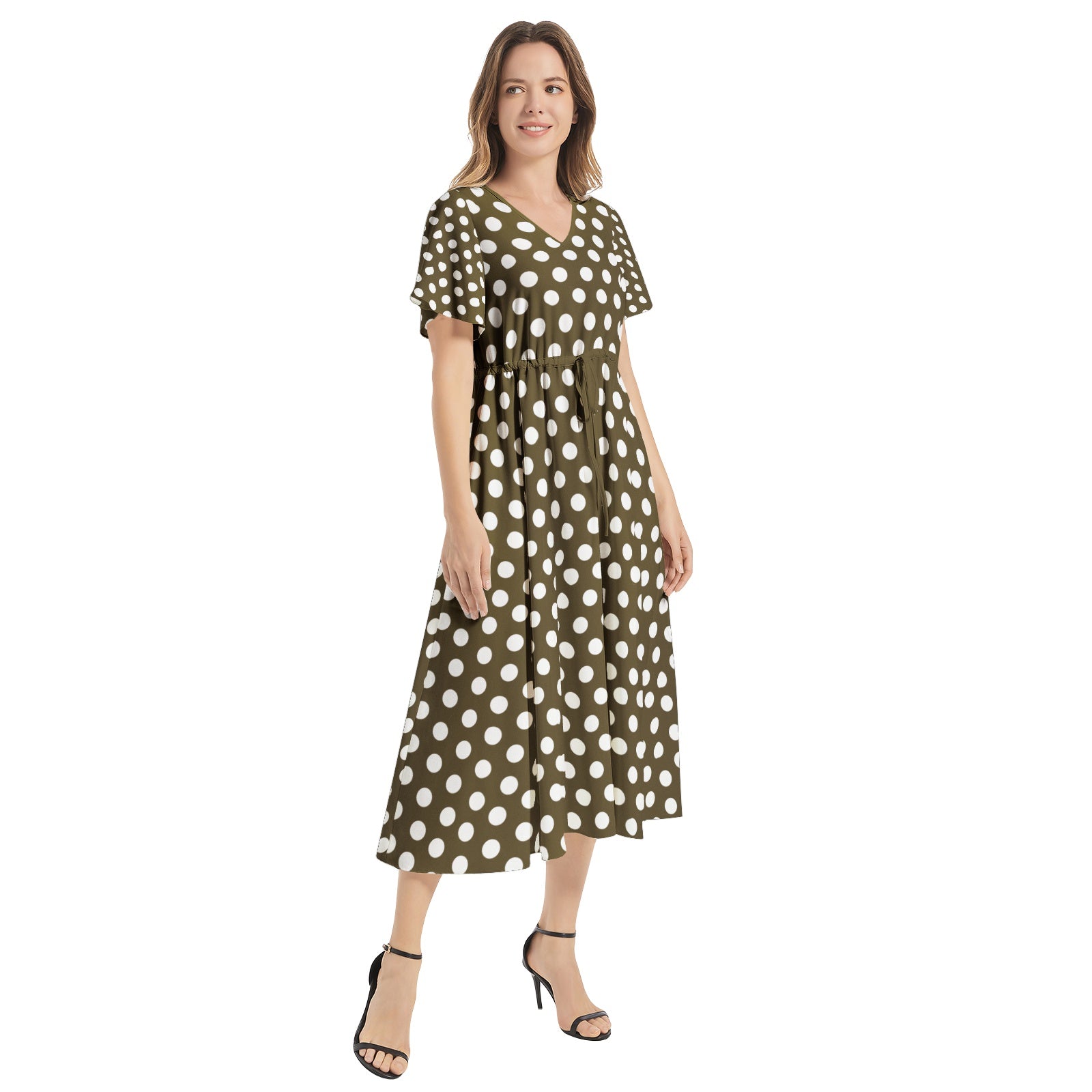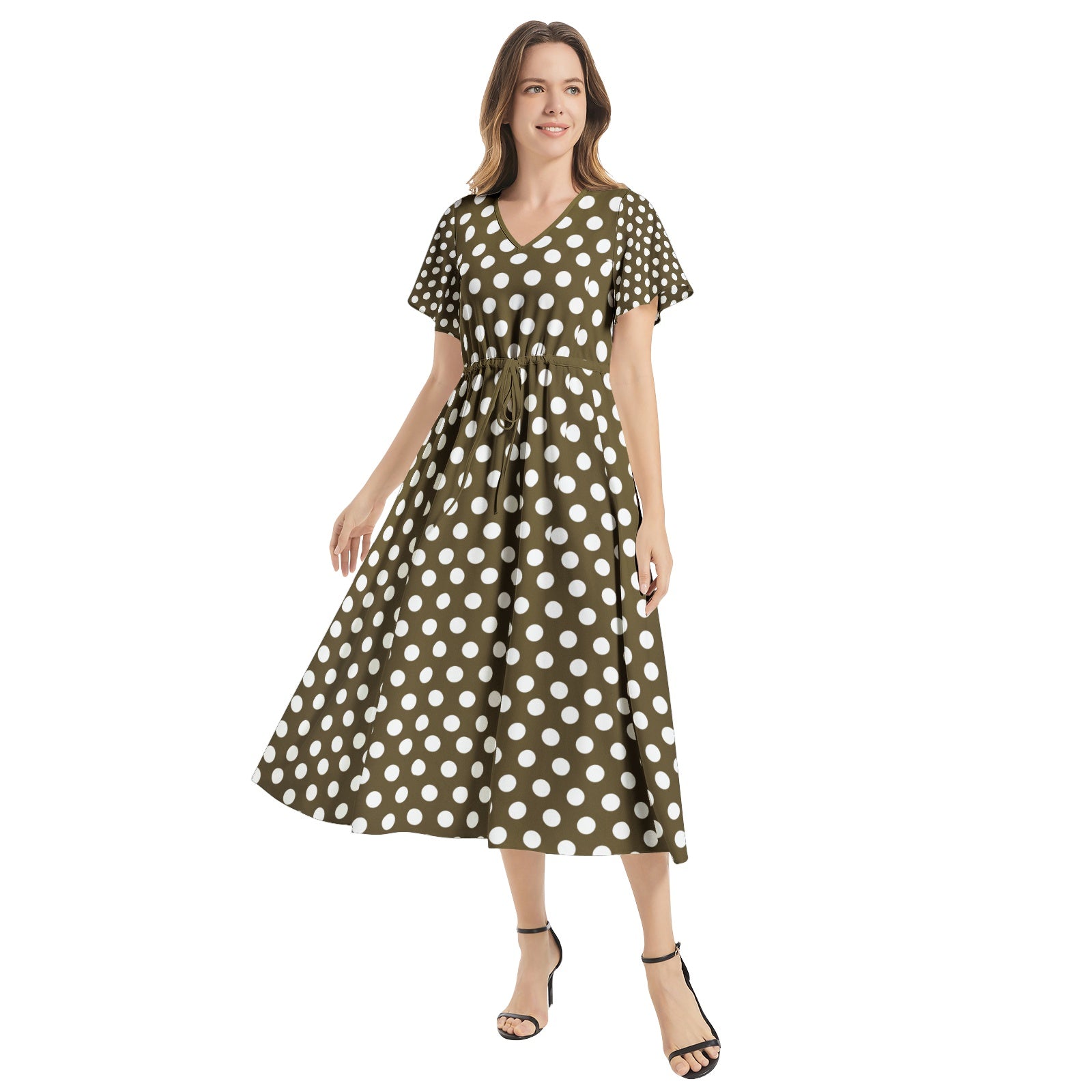 Snooty Fox Art Flutter Sleeve Drawstring Waist Flared Dress - Brown White Polka Dot