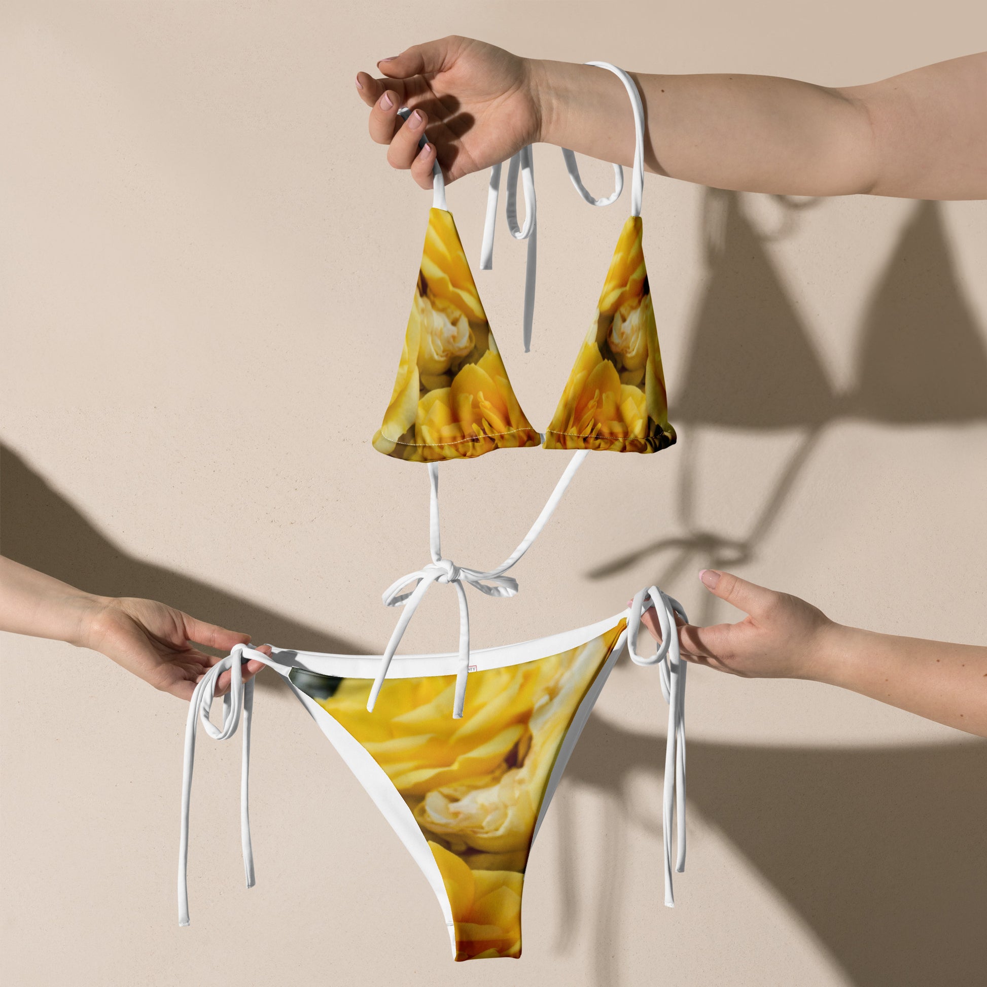 Disclaimer: To make your All-Over Print Recycled String Bikini last longer, thoroughly rinse it off after each use and get rid of any chlorine/salt residue.